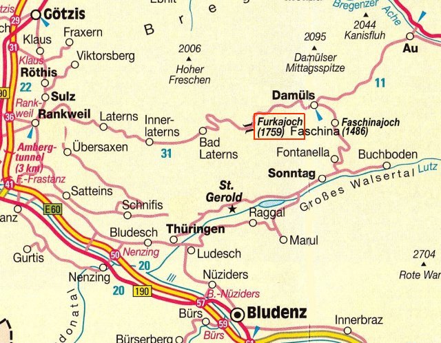 Die 39 km lange Straße über das Furkajoch verbindet Rankweil (500 m)