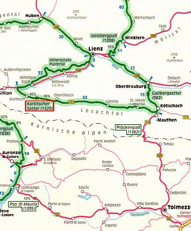 m). Vom Pustertal aus steigt die Straße bis kurz hinter Kartitsch (1395